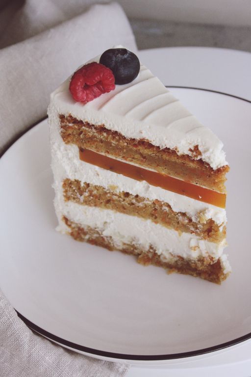 Пряный торт с корицей и кардамоном, морковные насыщенные влажные бисквиты с кремчизом, облепиховый мармелад. В составе есть орехи.