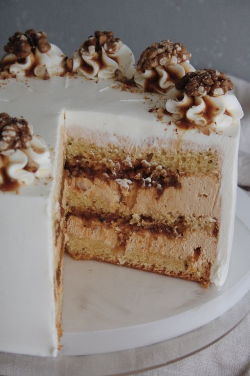 Фирменный торт со сливочными бисквитами, кремом на варёной сгущенке, орешками и курагой.