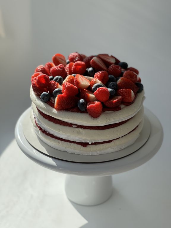 Павлова-меренговый торт с легким кремом на сливочном сыре и сливках, с ягодным или кули из маракуйи, оформляется горкой ягод.