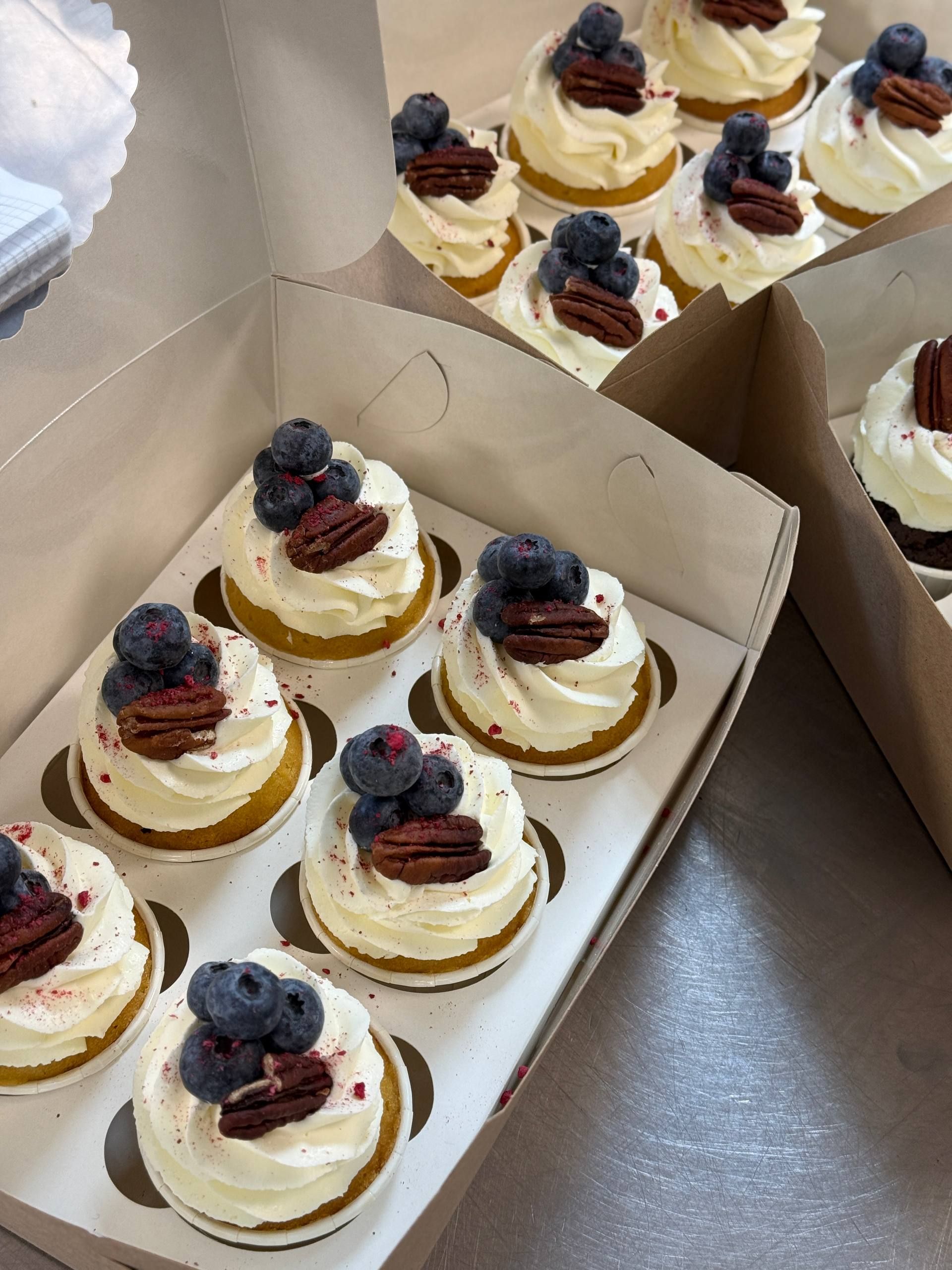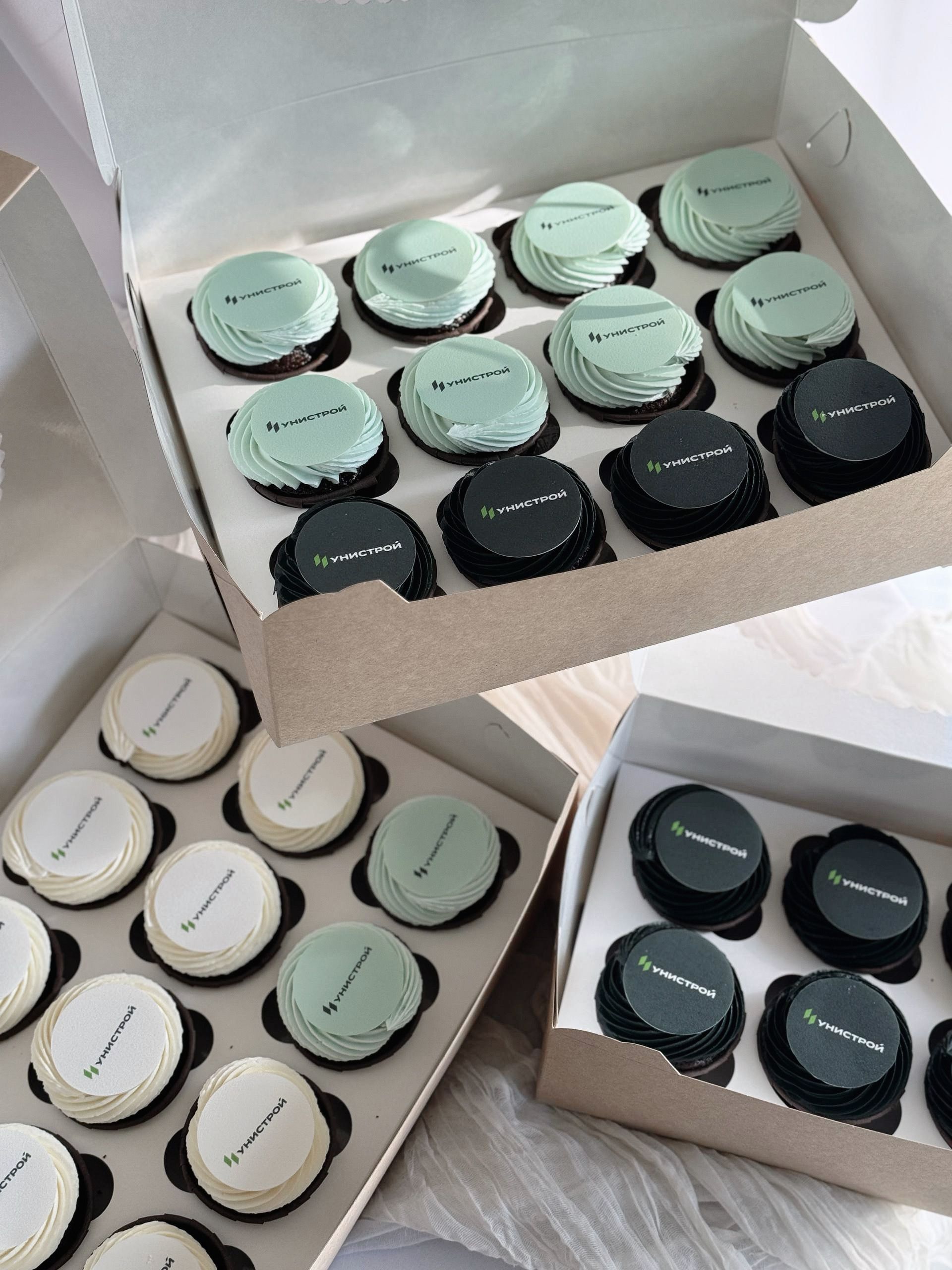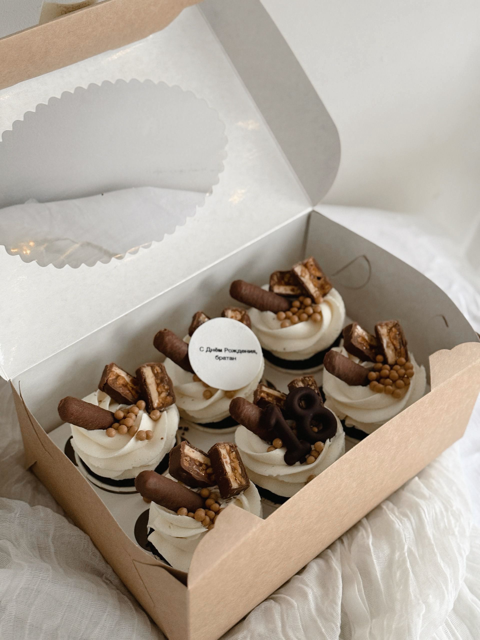 Состав: мука, сахар, какао ( в шоколадных), масло растительно, масло сливочное, разрыхлитель, ваниль, меланж, сливочный сыр, сливки 33%, ( в зависимости от начинки ингредиенты начинки + пектин, сахар, сгущеное молоко вареное). Состав оформления может меняться в зависимости от ТЗ.