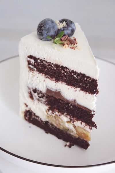 Шоколадные бисквиты на красном какао с кремчизом, слоем карамелизованного банана и нутеллой.