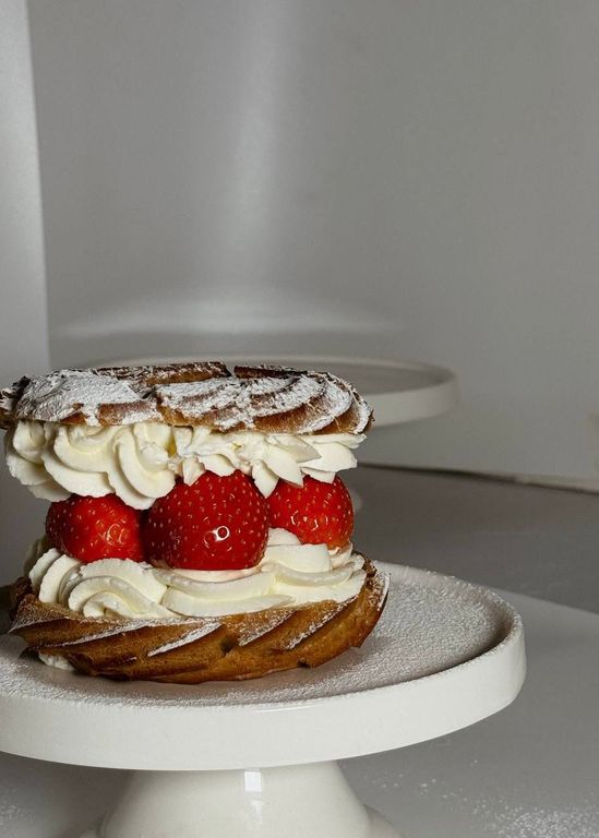Состав: желток пастеризованный, мука, вода, молоко, сахар, пудра сахарная, маскарпоне, сливки 33%, свежая клубника.
