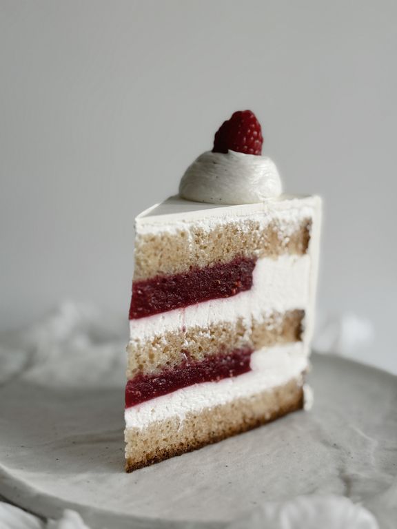 Ванильный бисквит, нежный пломбирный крем с бурбонской ванилью и компоте из малины. Идеальное лёгкое сочетание.