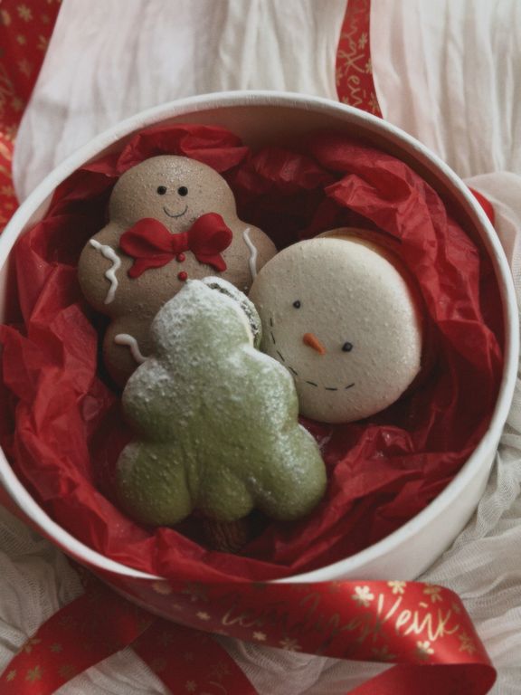 Макаронс к новому году, формовые. В подарочной круглой коробке, комплектуются лентой и открыткой к новому году.