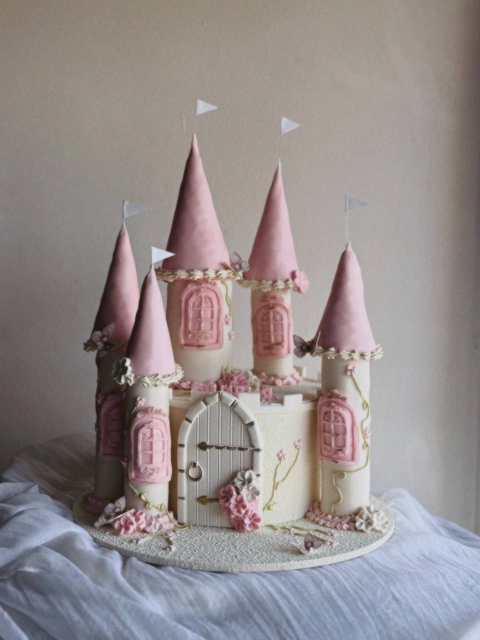 Торт нестандартной формы в виде замка с декором из сахарной пасты.