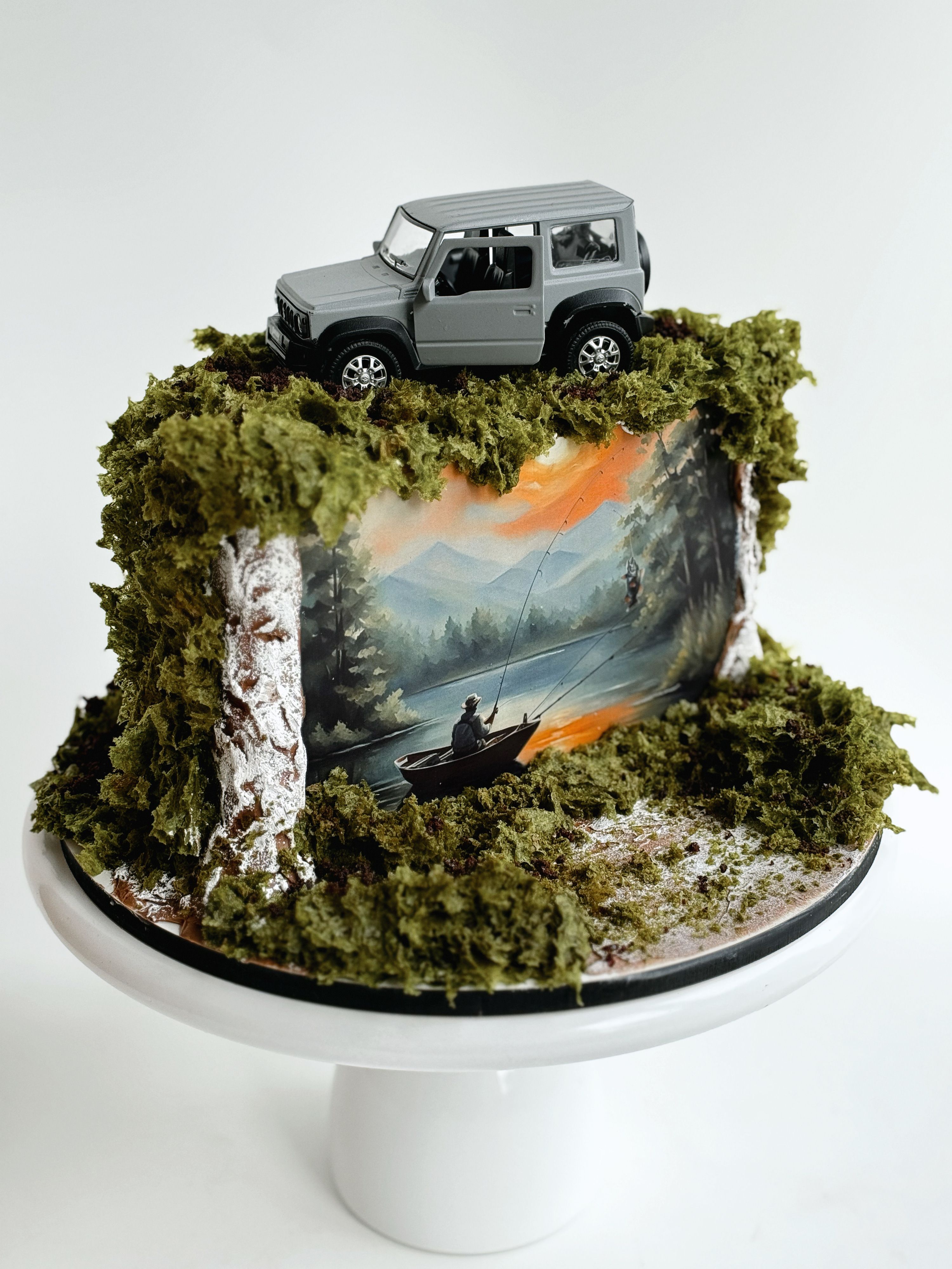 Оформление выолнено с помощью бисквитного мха, фотопечати и игрушечной машинки.