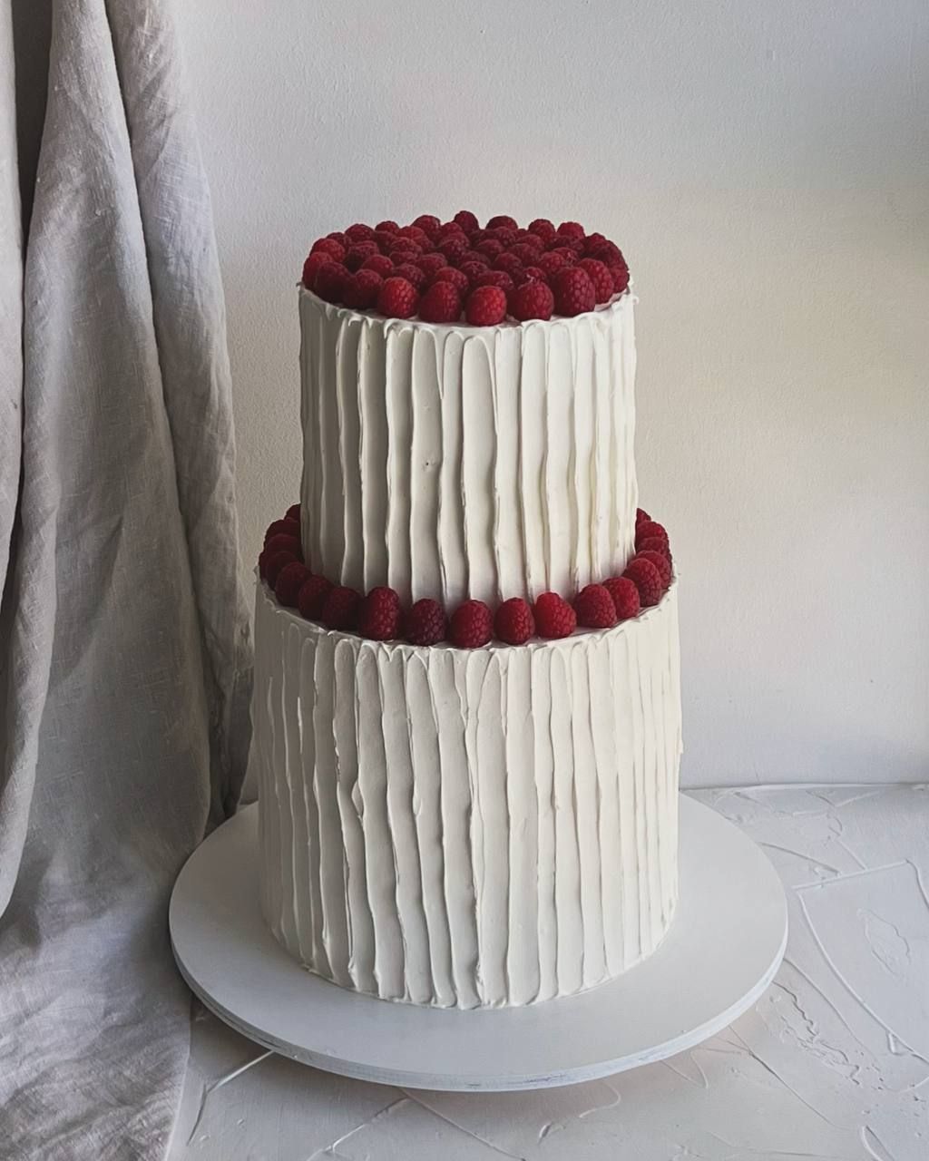 Декор торта выполнен фактурным покрытием ганашем на белом шоколаде и малиной.