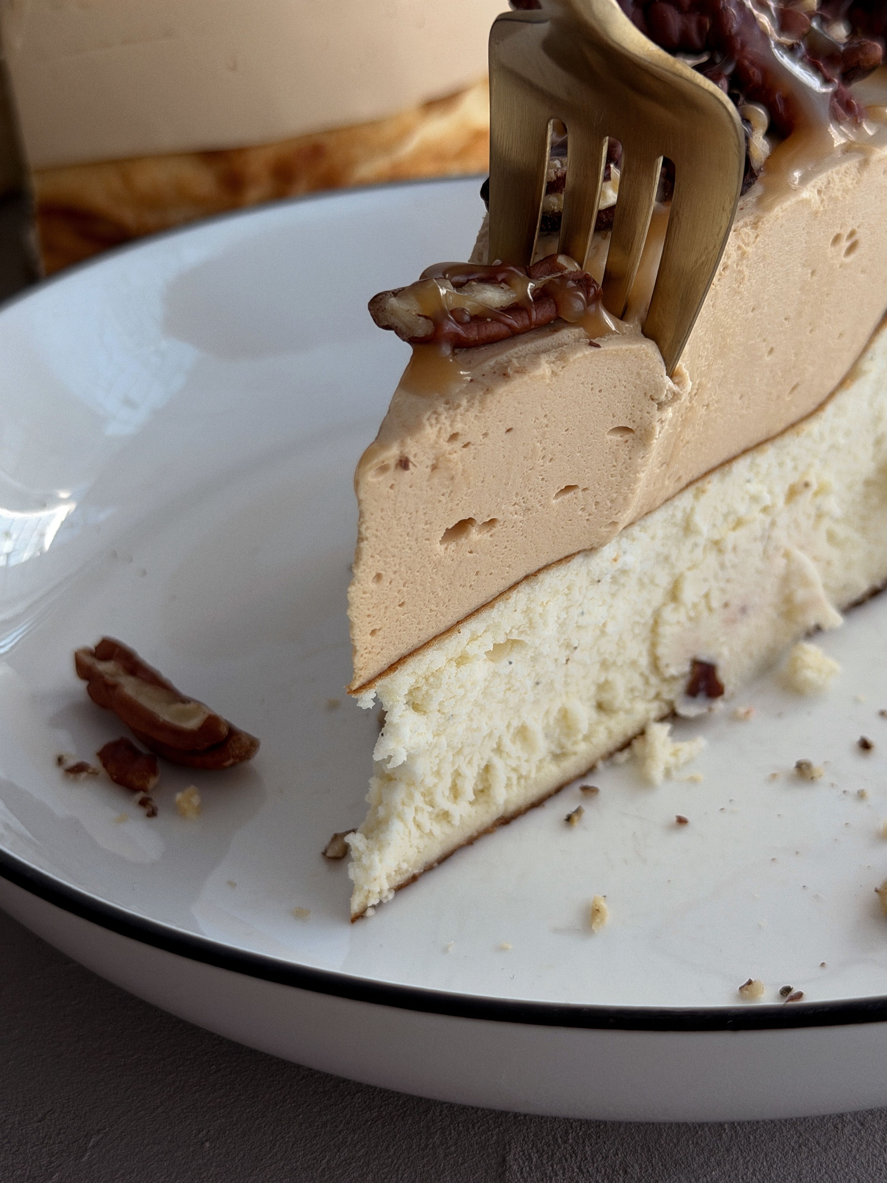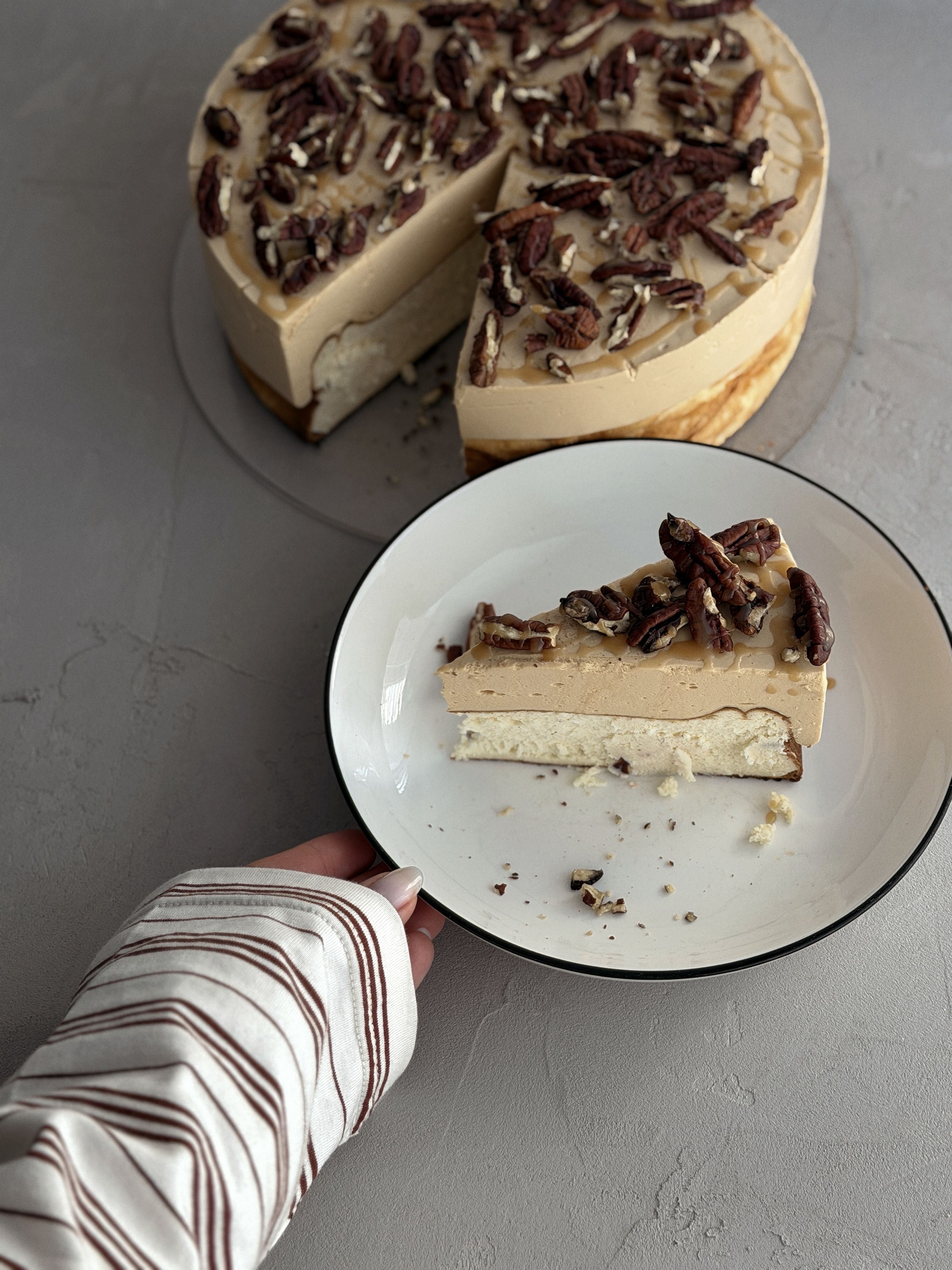 Чизкейк под карамельным муссом на вареной сгущенке, украшен орехом пекан и карамелью