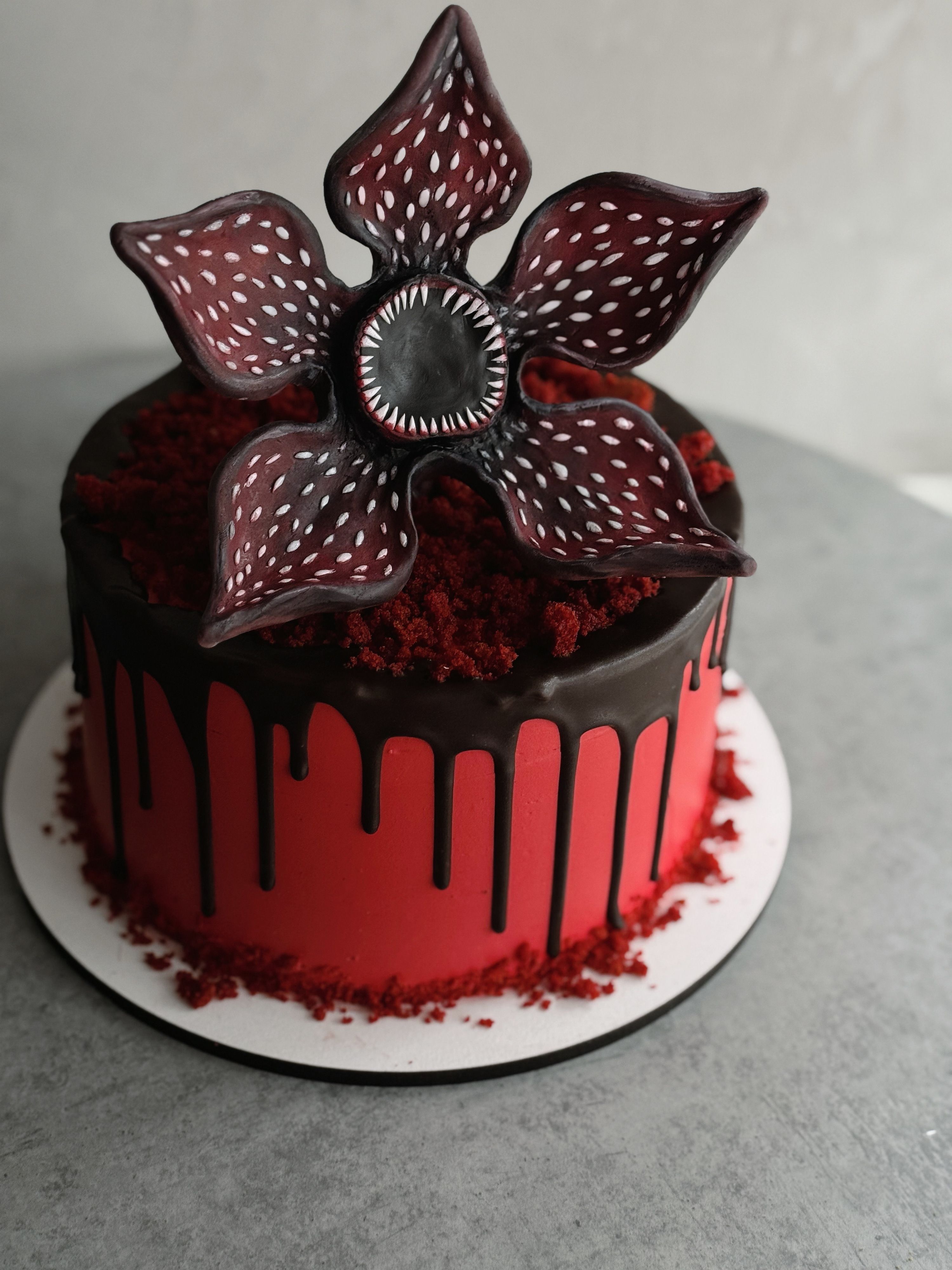 Оформление выполнено с помощью сахарной пасты, бисквитной крошки и шоколадных подтеков.
